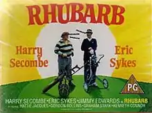 Rhubarb is a 1969 British short film written and directed by Eric Sykes, starring Sykes, Harry Secombe and Jimmy Edwards.[1] The dialogue consisted entirely of repetitions of the word "rhubarb", all the characters last names were "Rhubarb", and even the number plates on vehicles were "RHU BAR B". A baby "spoke" by holding a sign with the word "Rhubarb" written on it.