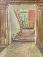 The plain façade gave little hint of the excellent carpentry within. The large panelled hall, wide stairs and a huge doorcase (Pictured at right), similar to the entrance door of the Great House at Laugharne,[14] were of excellent quality. Some inventive 19th century work had been undertaken, particularly an archway of beehive outline and gothic door, both with a hint of India.[14]