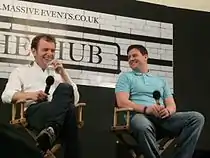 After reprisal from death, Davies felt further development was necessary for the character to continue as part of the drama; one of the first decisions the production team made was that "we can't make this guy look like a sap any longer. He's got to be made aware of what's going on." The events of the episode "Meat", in which Rhys learns the real nature of Gwen's job, are seen by Davies as a "rite of passage" for the couple. Director Colin Teague highlights Rhys' patience in relation to Gwen noting that "he puts up with an awful lot from his wife to be".[53] The second series also explores Rhys's insecurities and jealousies towards series protagonist Captain Jack Harkness, for whom a mutual sexual tension with Gwen was evident in the first series. Both Stephen James Walker and episode writer Catherine Tregenna felt that "the triangle of relationships between Rhys, Gwen and Jack" comprise "the most interesting narrative territory explored in 'Meat'".[50] Although actor Kai Owen feels that "Rhys will always have a little bit of a gripe about Jack", he concedes that "he respects him and he'll like him for looking after Gwen".[54] Walker comments favourably on the interaction between Jack and Rhys in "Meat" in both its antagonistic and comedic forms, citing the scene in the truck where Rhys questions Jack as particularly effective.[50] The two function as unusual literary foils for one another, insofar as their relationships with Gwen are concerned. In her critical essay Gwen's Evil Stepmother: Concerning Gloves and Magic Slippers, Valerie Estelle Frankel compares Rhys to Jack, likening the former to a "sweet, kind handsome prince" and the latter to a "compelling trickster."[55] Whilst Eve Myles feels that "Jack highlights how ordinary Rhys is", she states that it is precisely this ordinariness which makes Rhys a benefit to Gwen's strength of character.[56]