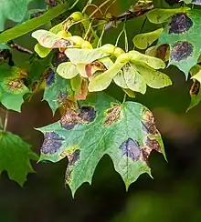 Tar spot is a localized disease that causes mostly cosmetic symptoms and is therefore not a highly controlled disease.[3] One of the best ways to manage the pathogen is through proper sanitation techniques.[3] Because the fungus overwinters in diseased leaf debris, removing the debris in fall can help reduce the occurrence of the disease.[3] In certain severe cases, fungicides can be implemented to help with control.[7][12] Copper fungicides sprayed in early spring when leaves are budding and twice more throughout the season help reduce the disease. However, chemical control is not normally used because this disease is mostly cosmetic. Resistant varieties are unknown. Also, because the affected tree species are of low economic value, yield reduction is of little concern to growers. By far the most important practice is to keep a clean yard and remove as much debris as possible.[3][5]