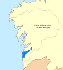 Vigo Ria (Spanish: Ría de Vigo) and (Galician: Ría de Vigo) is an estuary in Galicia, Spain. It is the southernmost ria of the Rías Baixas. It is located south of the province of Pontevedra, and extends in a northeast direction over a distance of 35 kilometres (22 mi) from its mouth at Cape Silleiro to the deepest point in Arcade, with a maximum width of 7 kilometres (4.3 mi) and is narrowest in the Strait of Rande, at 700 metres (2,300 ft). Its western entrance is protected by the Cies Islands, which are part of the National Park of the Atlantic Islands, within the islands of Toralla and San Simon. Its borders the north with Morrazo Peninsula. In the extreme south lies the Bay of Baiona. Its easy access, deep draft and calm waters make the Vigo estuary an ideal retreat for sailing and water sports.[1][2]