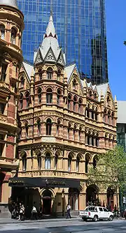 The site of the whole Rialto development ran between Flinders Lane and Collins Street, and was occupied by several buildings including numerous small warehouses on Flinders Lane, with lanes between including and Winfield Square and Robbs Lane. On the corner of Collins and King Street stood Robb's Buildings, named for the owner, railway builder John Robb, a grand classical styled 5-storey Victorian office building designed by Thomas Watts and Sons[3] in 1885, and one of the largest in the city at the time.[4] Next to that along Collins Street stood two interwar buildings, then the Rialto Building (1891) designed by William Pitt and the Winfield Building (1890) designed by Charles Debro & Richard Speight, both part of the five building Rialto building group, an historic streetscape along Collins Street running up to the 1880s Olderfleet Building to the east.