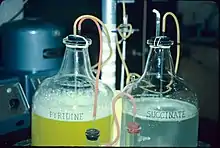 In 1935, Paul Gyorgy, in collaboration with chemist Richard Kuhn and physician T. Wagner-Jauregg, reported that rats kept on a B2-free diet were unable to gain weight.[53] Isolation of B2 from yeast revealed the presence of a bright yellow-green fluorescent product that restored normal growth when fed to rats. The growth restored was directly proportional to the intensity of the fluorescence. This observation enabled the researchers to develop a rapid chemical bioassay in 1933, and then isolate the factor from egg white, calling it ovoflavin.[2] The same group then isolated the a similar preparation from whey and called it lactoflavin. In 1934, Kuhn's group identified the chemical structure of these flavins as identical, settled on "riboflavin" as a name, and were also able to synthesize the vitamin.[2]