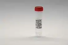 Bovine pancreatic ribonuclease, also often referred to as bovine pancreatic ribonuclease A or simply RNase A, is a pancreatic ribonuclease enzyme that cleaves single-stranded RNA. Bovine pancreatic ribonuclease is one of the classic model systems of protein science.[1] Two Nobel Prizes in Chemistry have been awarded in recognition of work on bovine pancreatic ribonuclease: in 1972, the Prize was awarded to Christian Anfinsen for his work on protein folding and to Stanford Moore and William Stein for their work on the relationship between the protein's structure and its chemical mechanism;[2] in 1984, the Prize was awarded to Robert Bruce Merrifield for development of chemical synthesis of proteins.[3]