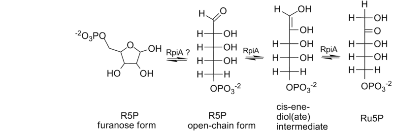 In the reaction, the overall consequence is the movement of a carbonyl group from carbon number 1 to carbon number 2; this is achieved by the reaction going through an enediol intermediate (Figure 1).[6] Through site-directed mutagenesis, Asp87 of spinach RpiA was suggested to play the role of a general base in the interconversion of R5P to Ru5P.[7]