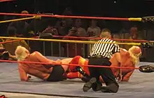 On the following episode of Impact!, Fortune formed an alliance with Hulk Hogan's and Eric Bischoff's new stable, Immortal.[126] On the November 18 episode of Impact!, Flair returned to the ring, competing in a match where he faced Matt Morgan, who had been kicked out of Fortune the previous month; Morgan won the match after Douglas Williams turned on the rest of Fortune, when they interfered in the match.[127] On January 25, 2011, it was reported that Flair had pulled out of TNA's Maximum Wooo! tour of Europe mid–tour after monetary disputes.[128] After missing a show in Berlin, Germany, Flair returned to the tour on January 27 in Glasgow, Scotland, reportedly apologizing to the locker room prior to the show.[129][130][131] On January 29, Flair wrestled his only match of the tour, defeating Douglas Williams in London, tearing his rotator cuff in the process making it his last singles win.[132][133] During Flair's time away from TNA, Fortune turned on Immortal.[134] Flair returned at the February 14 tapings of the February 17 episode of Impact!, turning on Fortune during a match between A.J. Styles and Matt Hardy and jumping to Immortal.[135][136] On the March 10 episode of Impact!, Flair defeated Styles and Hardy in a three–way street fight, contested as more of a two–on–one handicap match.[137] On April 17 at Lockdown, Immortal, represented by Flair, Abyss, Bully Ray and Matt Hardy, was defeated by Fortune members James Storm, Kazarian and Robert Roode and Christopher Daniels, who replaced an injured A.J. Styles, in a Lethal Lockdown match, when Flair tapped out to Roode.[138] The match was used to write Flair off television, as the following week he was scheduled to undergo surgery for his torn rotator cuff; however, Flair ultimately chose not to have the surgery as it would have required six months of rehab.[139][140]