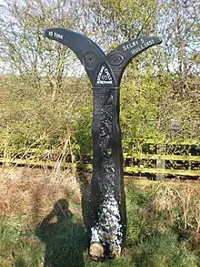 Riccall was the site of the base camp of Harald Hardrada in 1066.[7] He landed on the banks of the Ouse after sailing up the Humber Estuary and set up camp at Riccall before his victory in the Battle of Fulford.[16] However this was to be his last taste of victory, as his army was defeated shortly afterwards by the forces of King Harold Godwinson of England with the false parlay and preceding battle at Stamford Bridge, with many of his troops back at the base camp the battle was short and Hardrada himself died.[17] This battle had a knock-on effect as it distracted Harold from the defence of the south coast and left the land open to Norman invasion.[18] The event is commemorated in one of Riccall's streets, now a footpath, named after Olaf who looked after the camp in Harald's absence, and in Danes Hills, so named for its tumuli.[19] There is now a small information panel about the event at the bottom of Landing Lane, approximately where the Danes moored.