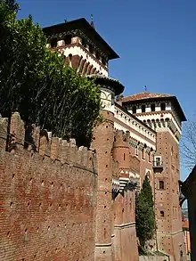 In 1910 Gualino bought a controlling interest from Baron Armin von Popper in the Forst Union, an indebted company that had various forest properties in the Habsburg Empire and in Romania and had a key role in the Austrian forest products export cartel. Gualino hoped to use this position to obtain a discount on the cartel's exorbitant prices, but had little success.[2] That year Gualino and his wife launched construction of a castle with almost 150 rooms in Cereseto, a small village near Casale Monferrato.[3] The Castello di Cereseto, in Neo-Quattrocento Piemont-Lombardy style, was completed in 1913.[4]