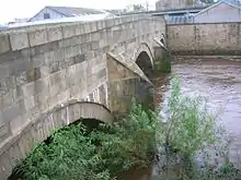 Riccarton Bridge is an 18th-century 3-span, segmental arched bridge, with dressed stone arch rings, rubble spandrels and triangular cutwaters.[40] The bridge was widened in 1806. The first recorded wheeled vehicles to be used in Ayrshire were carts offered gratis to labourers working on Riccarton Bridge, Kilmarnock, in 1726, and even then some of the labourers refused them.[41][42] The 1860 OS map shows that stepping stones crossed the River Irvine just upstream of the old bridge and just before the confluence of the Kilmarnock water with the river Irvine. The 'New' Riccarton Bridge lies just downstream and dates from 1839 and was also widened.