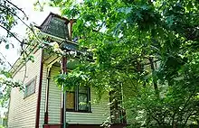 Siding on the structure is made of horizontal wood boards and is painted yellow with burgundy and Aquamarine accents.[5] Other exterior accents include bracketed posts and wood dentils.[4] There are three porches on the outside as well, each topped with a matching mansard roof on a smaller scale than the main roof.[4] One of these porches is a sun porch enclosed with glass, while the other two have arcaded bases supporting the roof.[4] The posts are decorated with detailed scroll work at the top.[4] Parts of the home have sets of paired windows, and the main entrance has an arched transom light to go with the pediment above the window.[4]