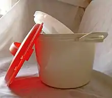 A microwave rice cooker is a container designed specifically for cooking rice. Some container consists of three parts: an outer bowl, a fitted lid with steam vents, and an inner bowl with a finely perforated base. Some others have only one container and the double-layered lid fitted with a steam vent.