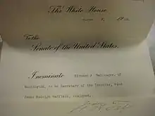 In 1909 despite previous promises to retain ex-President Roosevelt's cabinet officers, newly elected President William Howard Taft appointed Ballinger to replace conservationist (and fellow Ohioan) James R. Garfield as the U.S. Secretary of the Interior.[3] One of his first acts was to revoke executive protection of lands potentially subject to development of hydroelectric energy pending surveys, restoring them to the public domain for leasing. Progressives feared that hydroelectric monopolies would grab such sites either to control or preclude development and would then dictate energy prices, since 13 companies (including General Electric and Westinghouse) already controlled more than a third of waterpower resources as Roosevelt left office. However, that restoration soon provoked a scandal. In August, in conjunction with the National Irrigation Conference in Spokane, Washington, a United Press reporter published a story about 15,868 acres of land in Montana being sold to large corporations (General Electric, Guggenheim and Amalgamated Copper). Ballinger at first ignored the story, then accused reporters of opposing development in the West.[4] Although that Montana waterpower story proved to be overblown, accusations of favoritism continued to dog Ballinger as Secretary of the Interior.