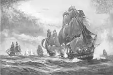On 2 June 1784, still serving under his cousin, Byron was promoted to midshipman of HMS Druid, searching for smugglers along the Devon and Cornish coast.[1] Byron served for a while under Druid's next captain, Joseph Ellison, who joined the ship in March 1785, then in November 1788, Byron rejoined his cousin who was at that time in command of the 36-gun Phoenix. Phoenix sailed for the East Indies where she took part in actions against Tippoo Sahib. During the campaign, the boat carrying George Byron overturned and, severely injured, he was sent home to England, where he later died. Richard Byron, who had been serving as master's mate, then transferred to HMS Crown, under the flag of Rear-admiral William Cornwallis, as a midshipman once more. Cornwallis later moved his flag to Minerva and was soon after followed by Byron. On 1 October 1792, Byron was promoted to lieutenant of the 36-gun HMS Perseverance.[1] When Perseverance returned to home waters in July the following year, Byron was on leave until he was appointed to Rear-admiral Caldwell's flagship, Impregnable in October 1793. Byron was aboard Impregnable when she fought in a fleet action on 1 June 1794.