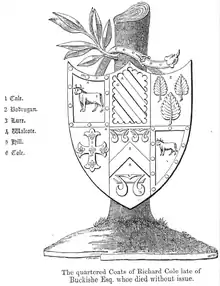 According to the Devonshire historian Risdon (died 1640), Richard Cole sold the estate of Slade, which had been the seat of his Cole ancestors from the reign of King Edward II (1307–1327), which soon afterwards became a seat of the Savery family.[18] According to the Devonshire historian Pole (d.1635), Richard Cole "conveyed this land" (i.e. Bucks and Wallen) "unto .... Cole of London, as I have bine enformed".[4] This was his second cousin[19] Gregory Cole (d.1660), a lawyer of the Middle Temple,[20] and of Petersham in Surrey, who founded a second line of the Cole family at Bucks and at Enstone in Oxfordshire. The large and elaborate monument of George Cole (d.1624) of the Middle Temple, Gregory's father, survives in Petersham Church. The estate of Bucks remained in the Cole family until 1802, on the death at the age of 96 of Rev. Potter Cole[20] (1705-1802),[21] a grandson of Gregory Cole and the last in the male line, Rector of Hawksbury in Gloucestershire for over seventy years. Potter Cole bequeathed Bucks to his nephew Rev. William Loggin of Long Marston in Gloucestershire, who in accordance with the bequest assumed the name and arms of Cole by Act of Parliament on 26 June 1802,[21] and was the father of the Rev. William Loggin, the owner of Bucks in 1822.[22]