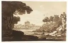 Cooper's work is typically dark, as he specialised in charcoal, pencil, pen and ink. He drew with a reed pen, which he used with rapid and flowing movements to produce strongly contrasted areas of light and shade. The yellow-brown tone of his broad washes suggest the ink used was bistre. The washes were diluted and applied over the iron gall pen work, causing the ink lines underneath to "bleed". The sheet is left bare in places to suggest falling sunlight. He would often sketch a scene to complete it in his studio years later. His subjects include Edward Kynaston, Sir Robert Naunton, John Lilburne, Mary Frith and Daniel Dancer. His landscapes often included the Thames riverbank, and around Windsor Castle, where he used his connections to gain access.