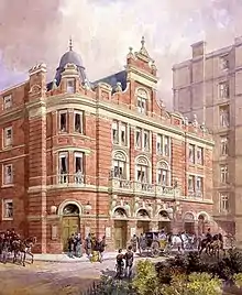 Carte's first production at the Royal English Opera House was of Sullivan's only grand opera, Ivanhoe, which opened in January 1891. It played for an initial run of 155 performances, a record for an opera. When it finally closed in July, Carte had no new work ready to play at the opera house, and so it had to close. The opera house re-opened in November 1891 with André Messager's La Basoche at first alternating in repertory with Ivanhoe, and then La Basoche played alone, closing in January 1892.[1] Carte again had no new opera to present at the house, and the venture soon failed. Sir Henry Wood, who as young man had been répétiteur for the production, recalled in his autobiography, "If D'Oyly Carte had had a repertory of six operas instead of only one, I believe he would have established English opera in London for all time. Towards the end of the run of Ivanhoe I was already preparing The Flying Dutchman with Eugène Oudin in the name part. He would have been superb. However, plans were altered and the Dutchman was shelved."[123] Carte leased the theatre to Sarah Bernhardt for a season and finally abandoned the project. He sold the opera house at a loss to the impresario Sir Augustus Harris.[1] It was then converted into a music hall, the Palace Theatre of Varieties, and later became the Palace Theatre.[124][125]
