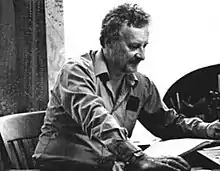 Loving's enamel works on copper often depicted stylized figures set in semi-abstract, primordial landscapes seemingly in flux (e.g., Untitled, 1959).[21][43][44] They employ painterly gesture influenced by Abstract Expressionism and bright colors sometimes flecked with gold and silver;[21][29][45] the work differs from traditional enameling in its modernist resistance to the medium's inherent decorativeness, achieved through the incorporation of disparate materials such as rough wood, multi-panel formats and large scale.[3] Loving largely discontinued enameling by the end of the 1960s, but writers cite its influence in his later work's use of color, transparency, and geometric divisions within canvasses.[21][3]