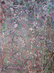 Loving's paintings of this era employed bright patterns of varied, restless line—rippling strokes, dotted lines and dashes he described as "obsessional mark-making"[7]— superimposed on richly colored, mottled color fields (e.g., Hathor's Gate Falling Right, 1977).[2][10][3] In these works, the mark served as his central technique, an indicator of time, human intention and energy, as well as a source of rhythm in his compositions.[35] Loving populated his canvasses with free-form, flat diagrammatic shapes (often with bold, electric outlines) and interior borders or portals, creating ambiguous, theatrical spaces that emphasized a contrast between diffuseness and definition (e.g., Water Connections, 1982).[5][10][49] Critic Alan Artner has related this work to Georges Seurat's, in terms of its technique and illusion of inner light, while also suggesting that it anticipated the Pattern and Decoration movement and later trends in abstraction evoking aerial, map-like associations.[1]