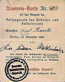 The revolutionaries took Berlin by surprise, almost no resistance was put against their actions. One day after the revolution, Müller became chairman of the "Executive Council of Workers' and Soldiers' Councils" (Vollzugsrat). By then this was the highest organ of the newly declared "Socialist republic of Germany", so that in theory Müller was head of state. But in fact power concentrated within the "Council of People's Representatives" (Rat der Volksbeauftragten), a revolutionary government dominated by Friedrich Ebert, leader of the Social Democrats. Müller and the more radical forces in the executive council lost power very quickly. They had to hand over executive powers to the Council of People's Representatives only two weeks after the revolution, and in the summer of 1919 Vollzugsrat was shut down by force after several strikes calling for socialization of core-industries were turned down as well. These strikes in the spring of 1919 were the biggest mass-mobilisation of the German council movement in which Müller was a leading figure. Together with his friend Ernst Däumig he wrote a very influential conception how council-communism could work in practise. By then, the periodical "The Workers-Council" (Der Arbeiter-Rat), was the theoretical organ of the council movement and Müller was one of its main authors. During the strike Movement in March 1919 Richard Müller was strike-leader for the larger Berlin area and tried to build a united front of all working class parties, but failed.[5]