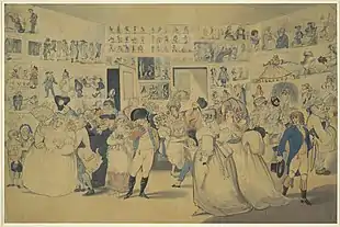 Born in London, Newton published his first caricature at thirteen. His work included caricatures expressing the English prejudice of the Scots as lean and hungry opportunists. He worked for radical publisher William Holland, producing anti-slavery works among his output, as well as "rude assaults" against Napoleon and the Royal Family.[1] Newton minded Holland's shop when Holland was imprisoned for sedition during 1793โ94. His watercolour (now in the British Museum) of fashionably dressed Londoners looking at prints in Holland's shop in Oxford Street, London, gives a depiction of an 18th-century print shop, and images of many of Holland's actual prints can be recognized on the walls.[2] In 1794, Holland published an edition of Laurence Sterne's A Sentimental Journey Through France and Italy with twelve plates by Newton.[3]