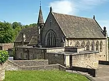Richmond School was the first school in Richmondshire. It accepted only boys and its only entry requirements were that pupils could read and write. Its original founding date is not known, however it first appears in a registry estimated to have been written in 1361–1474. It was awarded a charter ratifying its status on 14 March 1568 by Queen Elizabeth I and was one of the first free grammar schools in England.[2] The school was built on what is now the churchyard of St Mary's Church,[1][5] which stands opposite to and further up the hill to the former Richmond Lower School Building. In 1677 a new building replaced the Elizabethan one and this was used until 1850 when the school moved into a smaller building which still stands, and until 2011 was used for teaching.[6]