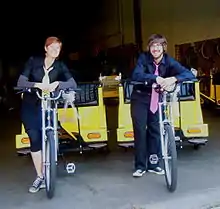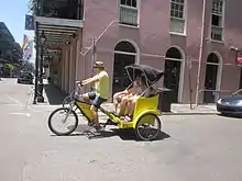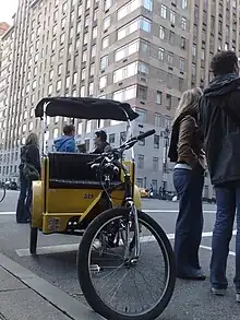 In New York, human powered transport is available as an environmentally friendly means of transit. Local residents in New York City, however, view pedicabs primarily as tourist vehicles due to their high fares and their drivers' aggressive sales pitches to pedestrians. At a rate of $5 plus $1 per block per person, a 20-block (one mile) pedicab ride for two people will cost $50.[1][2] In a taxicab, the same ride would cost under $10.[3] According to Peter Meitzler of New York's Manhattan Rickshaw Company, a passenger has an entirely different urban experience when one rides in a rickshaw. He says that he uses the word "rickshaw" in his company name because it is internationally known.[4]