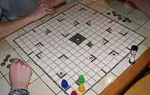 The object of the game is to bring the robot of the correct colour to the field indicated on the overturned chip using as few moves as possible. Any of the robots can be moved horizontally or vertically, and they do not stop until they reach an obstacle — either a wall or another robot. As soon as one of the players has found a solution, they state the total number of moves for all of the robots used and start a timer. Then every player has the chance to state the number of moves for their solution until the time runs out. After that, the player who stated the lowest number of moves shows their solution. If they correctly demonstrate a solution in the stated number of moves or less, they earn the chip. If not, the player with the next higher number may try, and so on; then a new chip is turned over and a new round begins. After all 17 chips have been used up, the player with the most chips wins the game.