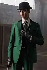 - The Riddler appears in Batman: The Enemy Within, voiced by Robin Atkin Downes.[24] This version is known as "Gotham's original costumed criminal", as he operated whilst the city was controlled by Thomas Wayne and Carmine Falcone. Despite being 60 years old, he is a skilled hand-to-hand combatant and practitioner of Bartitsu, which he uses in conjunction with his cane. A former employee of the Agency's scientific division SANCTUS, he was the only surviving human test subject of their experiments with the "LOTUS virus", a bioweapon that allowed him to maintain his youth but drove him insane. After disappearing for several years, he resurfaces as the leader of a criminal group called the Pact to steal the LOTUS virus as well as pursue personal revenge against the Agency and target Batman. In the midst of his attacks, Lucius Fox is inadvertently killed by a missile strike on Wayne Enterprises. Batman eventually defeats the Riddler, who is assassinated by Lucius' daughter, Tiffany. The Pact and Amanda Waller use the Riddler's body to create their own versions of the LOTUS virus, but their samples are destroyed by Agent Iman Avesta.