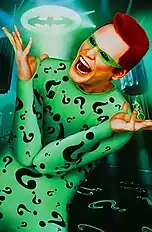 - Edward Nygma / The Riddler appears in Batman Forever, portrayed by Jim Carrey. This version is an eccentric, amoral inventor at Wayne Enterprises who designs "The Box", a device capable of draining people of their intellect. After Bruce Wayne rejects his invention, Nygma becomes the Riddler to prove his superiority to Wayne by obsessively sending him puzzles to solve. Riddler later allies with Two-Face and goes on a crime spree to fund his own company, NygmaTech, and mass-produce his technology, allowing him to absorb all of Gotham City's citizens' intelligence and deduce that Bruce Wayne is Batman. Ultimately, Batman overloads the information flowing into Riddler's brain, driving the latter insane before he is incarcerated at Arkham Asylum.