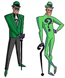 - Riddler makes cameo appearances in The New Batman Adventures, now sporting a unitard with a large question mark and no hair and mask.