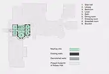The sole remaining part of the original McKay villa is the reception room on the ground floor and the royal suite directly above. The former was created in 1913 by removing the interior partitions of the villa; the baseboards, mouldings, and trims date from that era.[68] It is where small ceremonies and presentations take place, while the latter is an oval room that was previously the drawing room of the original McKay villa and was subsequently used as a ballroom, a studio, and a study before becoming the monarch's bedroom.[81] Some signs of the McKay house are still visible, notably in the now blanked window on the north wall of the reception room and the ornate plaster ceiling in the royal suite.