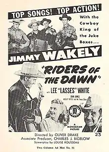 Riders of the Dawn is a 1945 American Western film directed by Oliver Drake and starring Jimmy Wakely, Lee 'Lasses' White and Sarah Padden.[1] It was produced and distributed by Monogram Pictures. The film's sets were designed by the art director Vin Taylor.