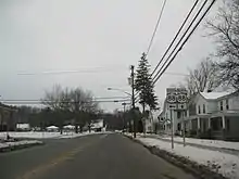 In Wolcott, the path of Ridge Road is known by several names as it traverses the industrial western half of the community—based around a spur of the Ontario Midland Railroad—and its residential eastern portion. It remains West Main Street until New Hartford Street, at which point it becomes just Main Street. One block later, Main Street splits into East Main Street and Mill Street, with Ridge Road following the latter northeast across Wolcott Creek. On the opposite bank of the creek, Mill Street meets Auburn Street, formerly the northernmost part of NY 89,[15] and changes names one last time to Oswego Street. The street leaves Wolcott village on an easterly routing, becoming CR 163 and Ridge Road at the eastern village line.[14]