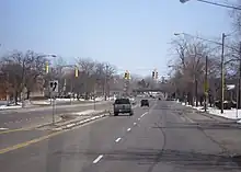 Most of Ridge Road between Lewiston and the city of Rochester 70 miles (113 km) to the east passes through rural, outlying areas of Niagara, Orleans, and western Monroe counties. While NY 31, a parallel highway 5 miles (8 km) to the south, passes through most of the region's largest communities—including the city of Lockport and the villages of Medina, Albion, and Brockport—Ridge Road and NY 104 bypass them entirely. Instead, the two-lane road passes through only small hamlets built up around junctions between NY 104 and other state routes.[5] This changes in central Monroe County, however, where Ridge Road (known locally as West Ridge Road) is six to nine lanes wide[6] as it serves as the backbone of a large commercial district in the town of Greece.[7] Once in Rochester, West Ridge Road enters areas more residential and industrial in nature, including the sprawling Eastman Business Park near the Genesee River.[8]