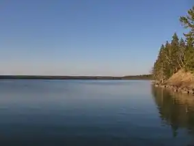 During the last ice age most of the vegetation in the Riding Mountain region was eliminated, and it remained this way after the retreat of the glaciers 12,500 years ago.[34] The Riding Mountain upland and surrounding plains and Manitoba Escarpment were mostly carved in the Tertiary era, but the ice sheets of the Pleistocene period modified the drainage and appearance of the land.[32] Only the movement of the last ice sheet in this period left a visible effect on the features of the region.[32] About 11,500 years ago a spruce dominated forest began to emerge in its place, with some of the vegetation being ash, juniper, sedges, buffaloberry, and trembling aspen.[34] After this time the climate was dry, and the percentage of spruce decreased.[34] During the Holocene climatic optimum up until 6500 years ago the amount of herbs, shrubs and grasses in the park increased. At the end of this time beaked hazelnut appeared and the amount of bur oak increased, with the climate becoming cooler and moister.[34] Up to 2,500 years ago the amount of grassland species in general decreased and boreal forests migrated into the Riding Mountain region. It was at this moment that ecosystems began to resemble those of today, with species such as tamarack, fir, alder, pine and spruce becoming more common.[34] Several streams that run through the park have headwaters in Riding Mountain's lakes.[32] Clear Lake's water comes from underground springs rather than from streams.[32]