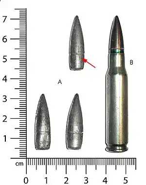 Rifling may not begin immediately forward of the chamber. There may be an unrifled throat ahead of the chamber so a cartridge may be chambered without pushing the bullet into the rifling. This reduces the force required to load a cartridge into the chamber, and prevents leaving a bullet stuck in the rifling when an unfired cartridge is removed from the chamber. The specified diameter of the throat may be somewhat greater than groove diameter, and may be enlarged by use if hot powder gas melts the interior barrel surface when the rifle is fired.[17] Freebore is a groove-diameter length of smoothbore barrel without lands forward of the throat. Freebore allows the bullet to transition from static friction to sliding friction and gain linear momentum prior to encountering the resistance of increasing rotational momentum. Freebore may allow more effective use of propellants by reducing the initial pressure peak during the minimum volume phase of internal ballistics before the bullet starts moving down the barrel. Barrels with freebore length exceeding the rifled length have been known by a variety of trade names including paradox.[18]