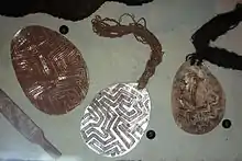 One of the unique patterns used in the Kimberley region of Western Australia is a pattern of interlocking designs. The incised designs are highlighted with a mixture of ochre and Spinifex resin, which is rubbed into the grooves. Decorated and plain pearl shells are used for rain-making and magical purposes or for trade.
