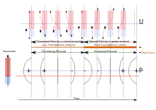 The Sondhauss tube operates in a way that is basically similar to the Rijke tube: Initially, air moves towards the hot, closed end of the tube, where it's heated, so that the pressure at that end increases. The hot, higher-pressure air then flows from the closed end towards the cooler, open end of the tube. The air transfers its heat to the tube and cools. The air surges slightly beyond the open end of the tube, briefly compressing the atmosphere; the compression propagates through the atmosphere as a sound wave. The atmosphere then pushes the air back into the tube, and the cycle repeats. Unlike the Rijke tube, the Sondhauss tube does not require a steady flow of air through it, and whereas the Rijke tube acts as a half-wave resonator, the Sondhauss tube acts as a quarter-wave resonator.[11]