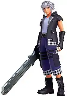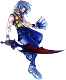 Riku is a childhood friend and rival of Sora, who resides with him and Kairi on Destiny Islands.[12][13] He appears as a non-playable character in the original game, where he is introduced as a 15-year-old boy. During the invasion of Destiny Islands by the Heartless, Riku immerses himself in darkness to discover new worlds beyond his home. Arriving at Hollow Bastion, Riku is manipulated by Maleficent into aiding her plans for world conquest in exchange for knowledge to restore Kairi's missing heart. His signature weapon is the Soul Eater sword, a manifestation of the darkness in his heart. During the first game, Riku is revealed to be the rightful owner of Sora's Keyblade, which was bequeathed onto the five-year-old Riku by Terra during the events of Birth by Sleep; however, his reliance on the power of darkness caused the Keyblade to reject Riku in favor of Sora.[14] He is later tricked into allowing Xehanort's Heartless, Ansem, to possess his body. Following Ansem's defeat, Riku helps Sora and King Mickey close the door to Kingdom Hearts, remaining on the other side with the king.[15][16]