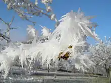 Soft rime is a white ice deposition that forms when the water droplets in light freezing fog or mist freeze to the outer surfaces of objects during calm or light wind. The fog usually freezes to the windward side of solid objects, particularly those with a likeness to that of tree branches and wires.