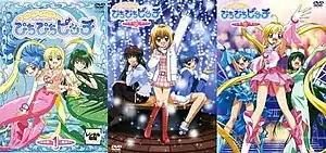 Three DVD covers showing the three forms of the main characters Lucia Nanami (blonde), Hanon Hosho (blue), and Rina Toin (green): mermaid (left cover), human (center cover), idol (right cover).