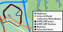 There are several ring roads in Singapore which aid relieving congestion on arterial road running through a town or area. These rings roads are usually served by a feeder bus service or complemented by a Light rail line, such as the Bukit Panjang LRT in Bukit Panjang.