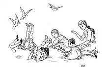 Evidence of similar children's round-dances appears in continental paintings. For example, Hans Thoma's Kinderreigen (children dancing in a ring) of 1872 takes place in an Alpine meadow, while his later version of the game has the children dancing round a tree.[20] The Florentine Raffaello Sorbi transported the scene to the Renaissance in his 1877 Girotondo (Round-dance), in which young maidens circle a child at the center to an instrumental accompaniment.[21]