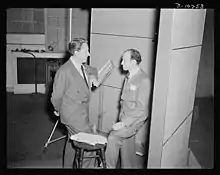 ![]() Spencer Tracy (left) and Garson Kanin (right) at the Long Island studios of the Army Signal Corps for the recording of Tracy's narration for Ring of Steel | |