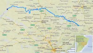Rio Grande[2] (Portuguese for "great river") is a river in south-central Brazil. It rises in the Mantiqueira Mountains in the state of Minas Gerais and descends inland, west-northwestward. Its lower course marks a portion of the Minas Gerais-São Paulo border. At the Mato Grosso do Sul state border, after a course of 1,090 km (677 mi),[3] it joins the Paranaíba River to form the Upper Paraná River.
