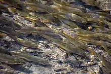 The Rio Grande Chub does not currently have any federal protections or listings under the Endangered Species Act. However, the US Forest Service lists this fish as a sensitive species. It is also listed as a sensitive species with the Bureau of Land Management.[4] Populations of the Rio Grande Chub have significantly decided from historical levels. At one point, this Chub was the most common fish in the Rio Grande Watershed. It is estimated that overall numbers have declined by 75 percent.[5] One of the largest factors that has been attributed to the decline of the Rio Grande Chub is the introduction of other non-native fishes. Brook trout and Brown trout were both introduced into the Rio Grande watershed. They replaced the Rio Grande Cutthroat trout as ecosystem's top predator. Both of these species compete with the Rio Grande Chub for resources. They also prey upon the Chub. Other non-natives like Common Carp and Northern Pike are also suspected to prey on the Rio Grande Chub at various stages along its life cycle.[5]