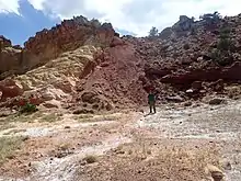 Basin size generally decreases to the north in the rift, though the Española covers approximately 120 kilometres (75 mi) north–south and 40 kilometres (25 mi) east–west, and the San Luis is roughly 120 by 80 kilometres (75 by 50 mi). These basins may contain smaller units within them, such as the Alamosa basin within the San Luis, which is bounded by the San Juan and Tusas mountains on the west and the Sangre de Cristo Mountains in the east.[5] The Albuquerque basin is the largest of the three basins, spanning 160 kilometres (99 mi) north–south and 86 kilometres (53 mi) east–west at its widest points. It is the oldest of the three major basins, and contains 7,350 metres (24,110 ft) of Paleogene clastic sediments deposited on Precambrian basement. The southernmost Albuquerque basin contains pre-rift volcanic deposits, while the central and northern portions contain volcanics erupted during rifting.[3]