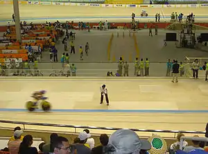 In April 2015, construction was temporarily suspended by Brazil's Ministry of Labor and Employment, claiming a "grave and imminent danger to the physical safety of workers."[16] The ministry cited their concerns for "the absence of collective protection", and risk of workers falling, in addition to lack of security, no technical report on the stability of slopes at the site, and what was described as a potentially hazardous "accumulation of material".[17] The temporary suspension added even more stress on the construction's timetable, with works being sped up significantly afterwards, with the Organising Committee stressing that "work was back on track."[16] Unfortunately, delays proved to be a valid concern, when cycling test events originally scheduled to take place at the Velodrome on 18 – 20 March 2016 were rescheduled to 29 April – 1 May, due to a delay in the installation of the velodrome's track.[18] Blame was put on poor conditions for the installation of the Siberian-sourced timber, which could potentially lead to the wood warping and bending.[19][20] It was by then that President of the UCI Brian Cookson made public his concerns about the completion of the venue, bluntly stating to the media, in a press conference after the 2016 UCI Track Cycling World Championships, that completing the venue in time for test events in late April was "a challenge", and that "if the velodrome is not ready in time, there is no plan B."[15]