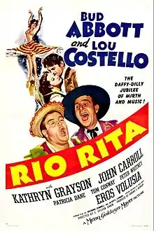 Rio Rita is a 1942 American comedy film directed by S. Sylvan Simon and starring Abbott and Costello. It was based upon the 1927 Flo Ziegfeld Broadway musical, which was previously made into a 1929 film also titled Rio Rita that starred the comedy team of Wheeler & Woolsey. Kathryn Grayson (in her first starring picture) and John Carroll replace the 1929 version's Bebe Daniels and John Boles.[2]