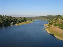 The first notable city on the Tagus is Sacedón. Below Aranjuez it receives the combined flow of the Jarama, Henares, Algodor and Tajuña. Below Toledo it receives the Guadarrama River. Above Talavera de la Reina it receives the Alberche. At Valdeverdeja is the upper end of the long upper reservoir, the Embalse de Valdecañas, beyond which are the Embalse de Torrejon, into which flow the Tiétar, and the lower reservoir, the Alcántara Dam into which flows the Alagón at the lower end.